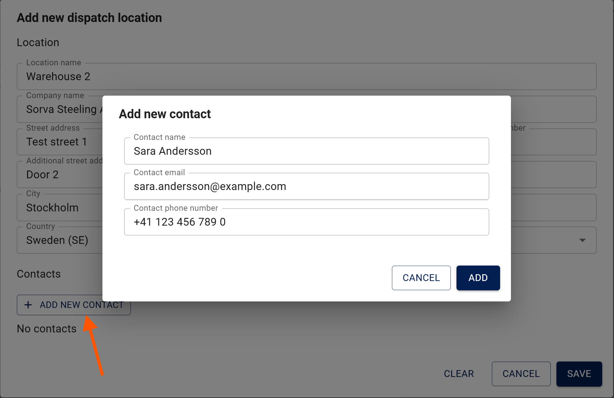 Use + Add new contact to add new dispatch contact person. Fulfill contact person's name, email and phone number and select Add to add person to be a contact person.