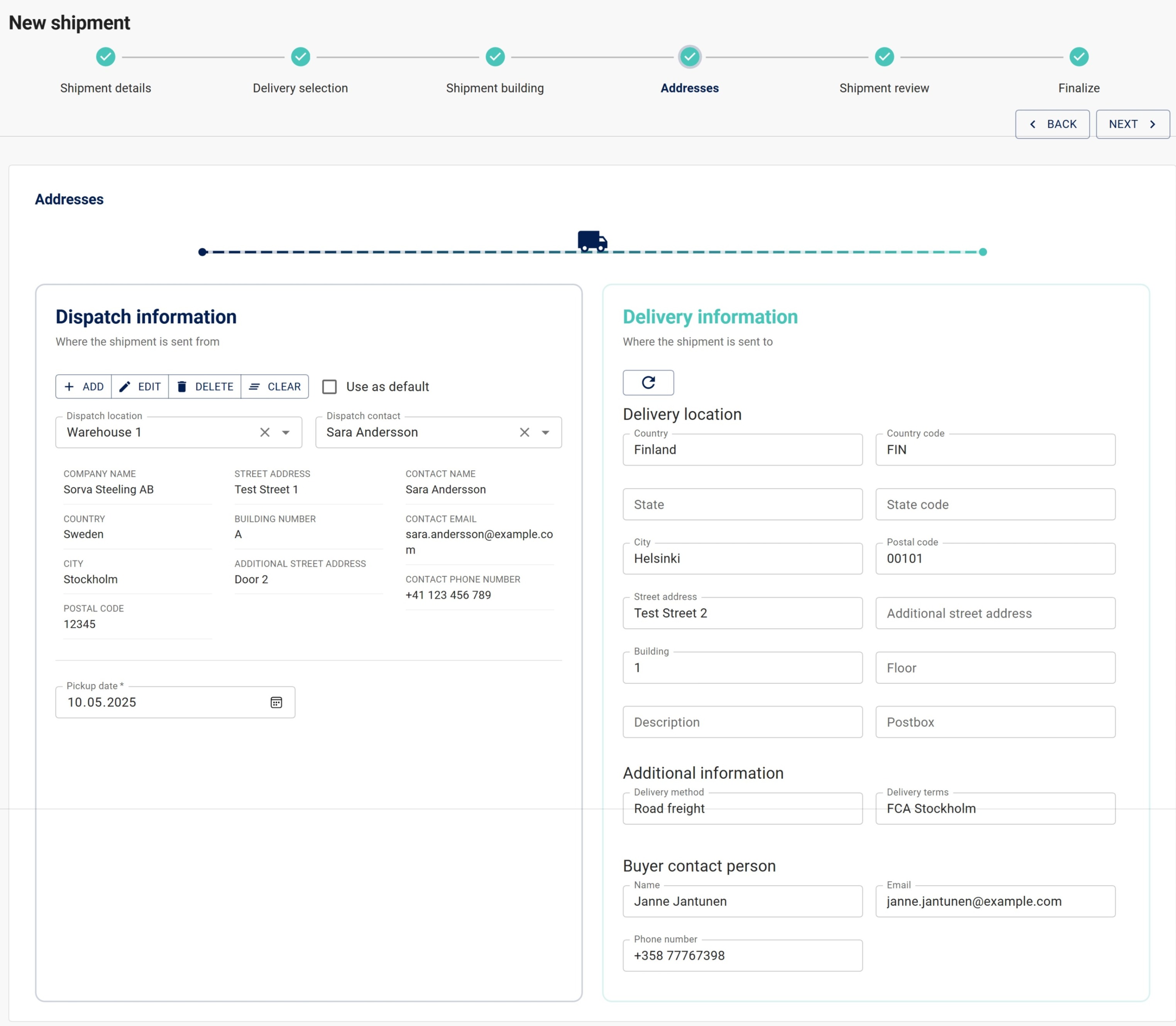 Delivery location and address details, additional information including delivery method and delivery terms, and buyer contact person will be automatically pre-filled from the customer's order or orders selected to be shipped.