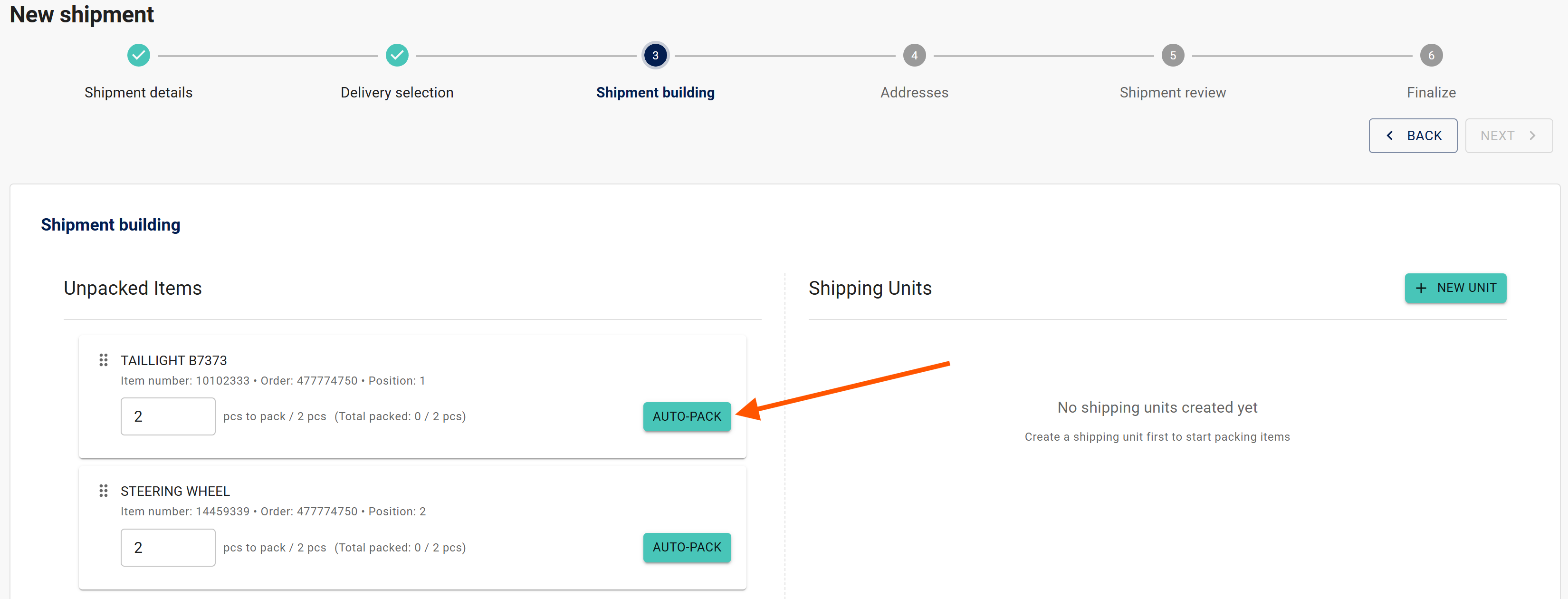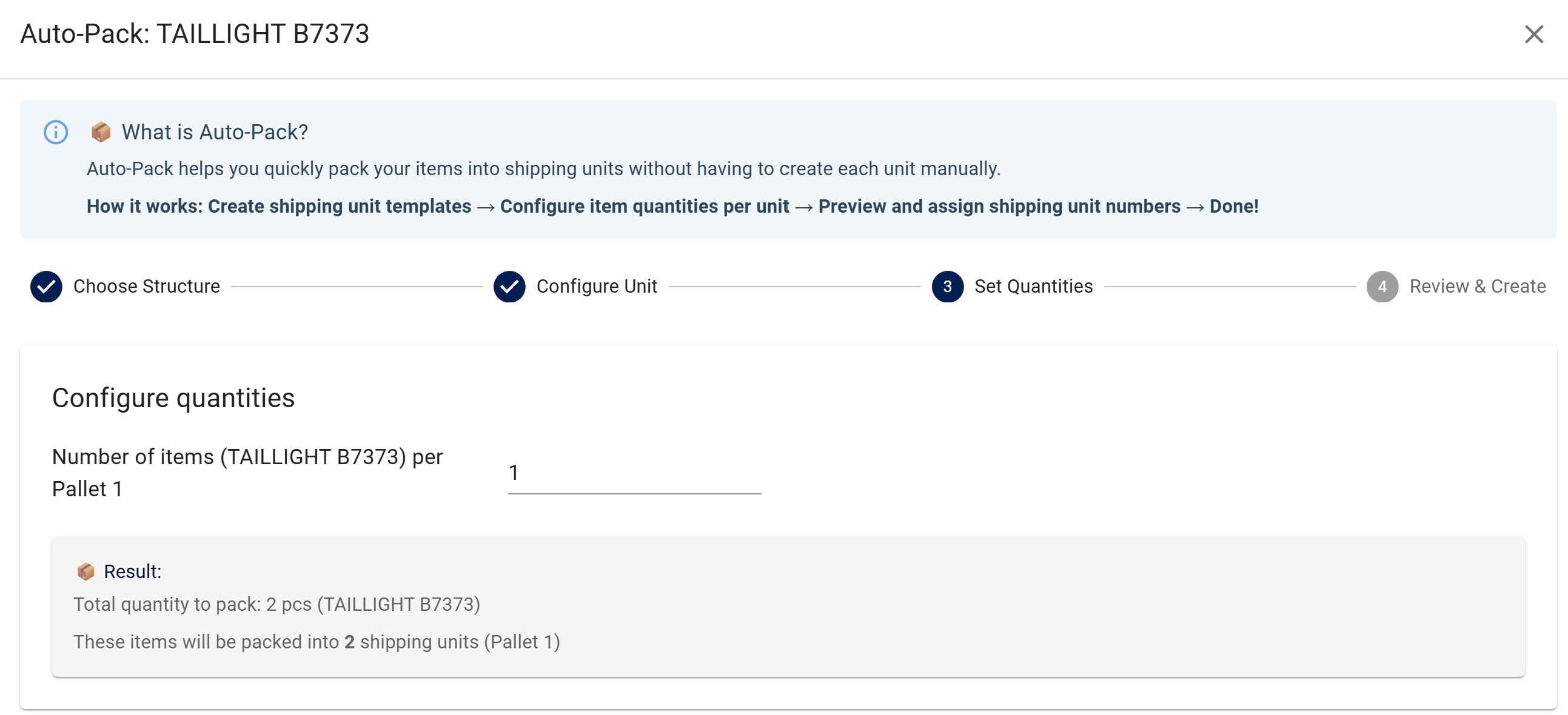 Auto-pack helps you quickly pack your items into shipping units without having to create each unit manually. Use the auto-pack functionality when you need to create multiple identical shipment units that contain the same number of items.