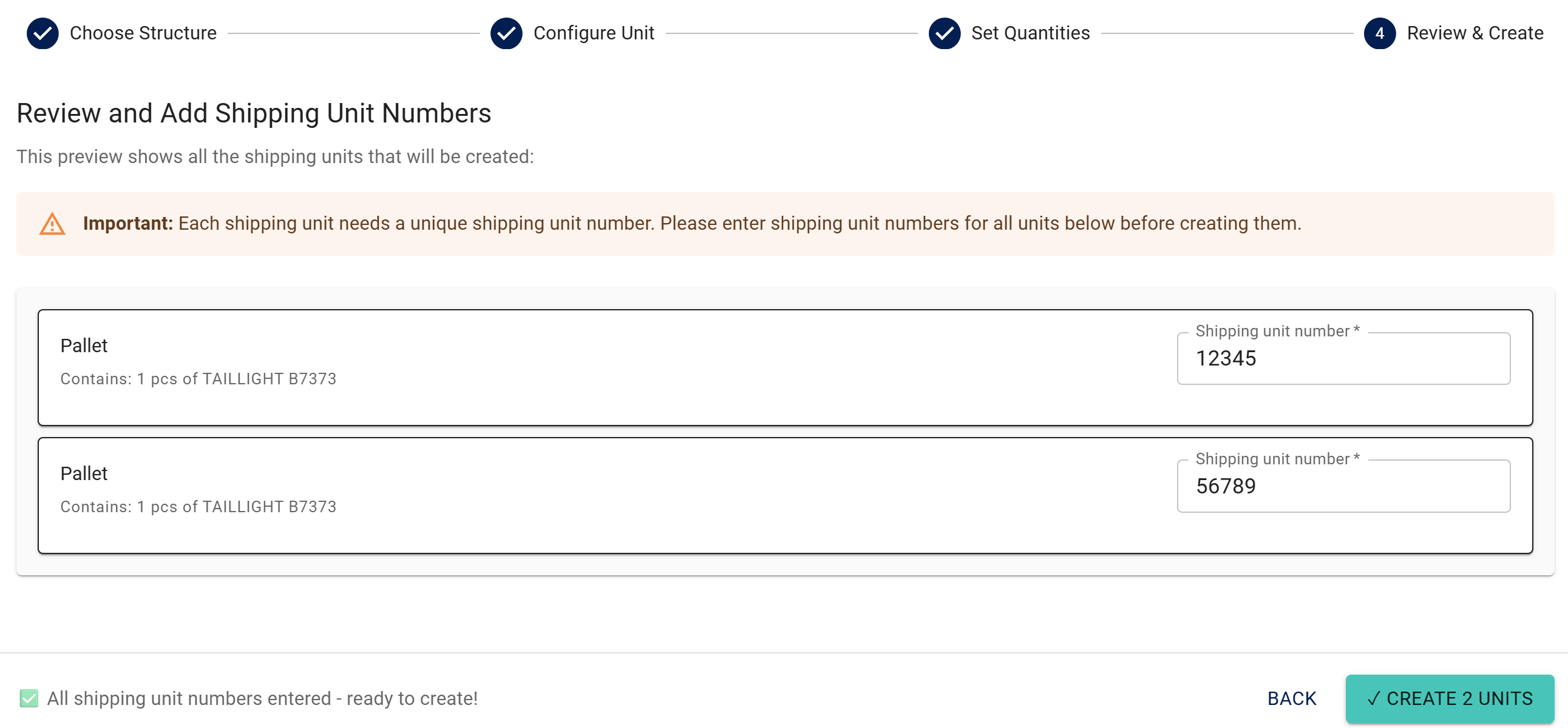 4. Review and create: Jakamo will show how many shipping units will be created and how many items will be placed inside each unit. Fulfill unique Shipping unit numbers for each shipping unit before creating units.