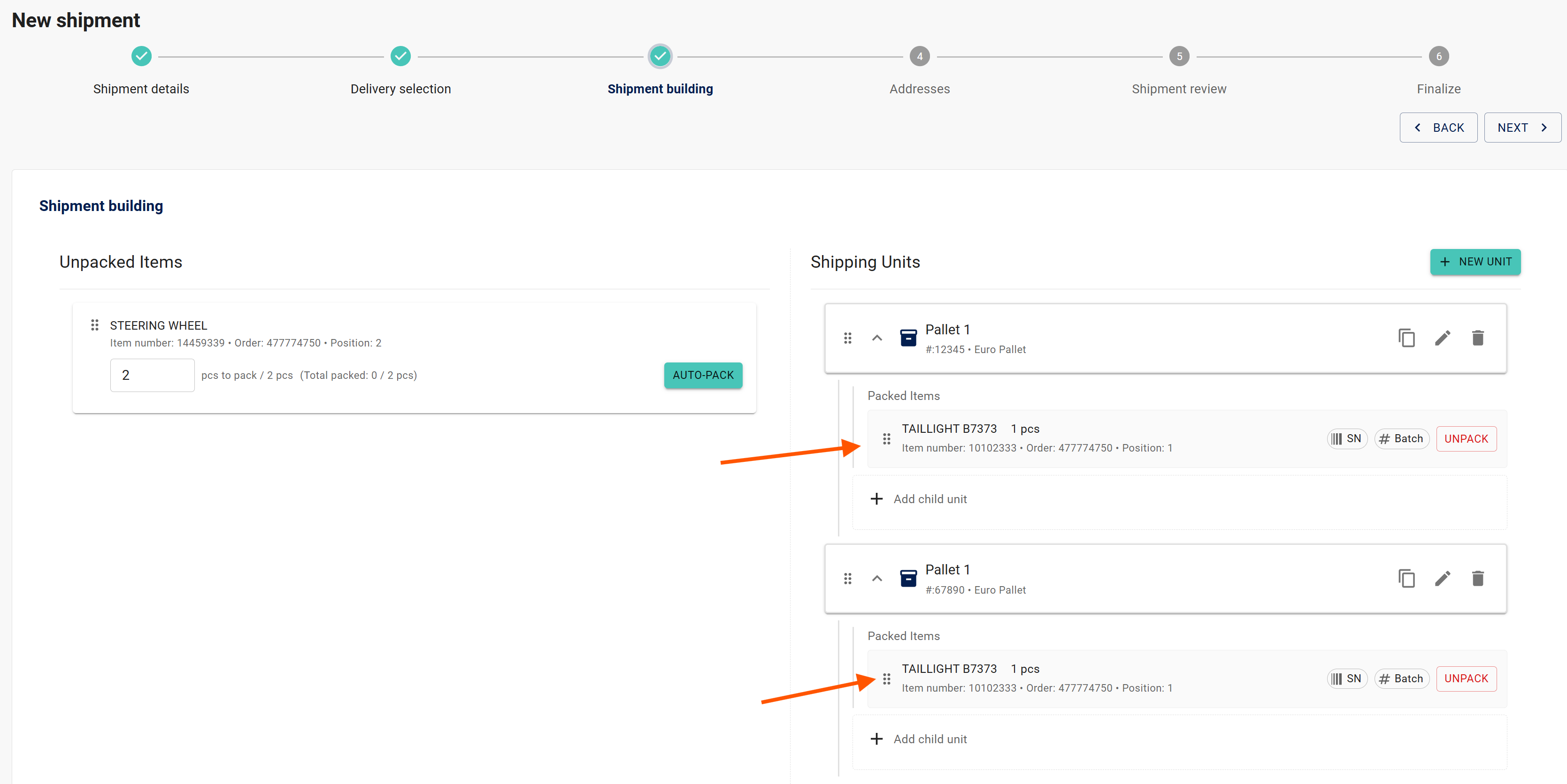 Build your shipment by selecting the types of shipping units it will include. Then, assign each item to the appropriate shipping unit. A shipment can contain one or multiple shipping units, which may be identical or different in type. Shipping units can also be nested within each other, forming a parent-child structure.