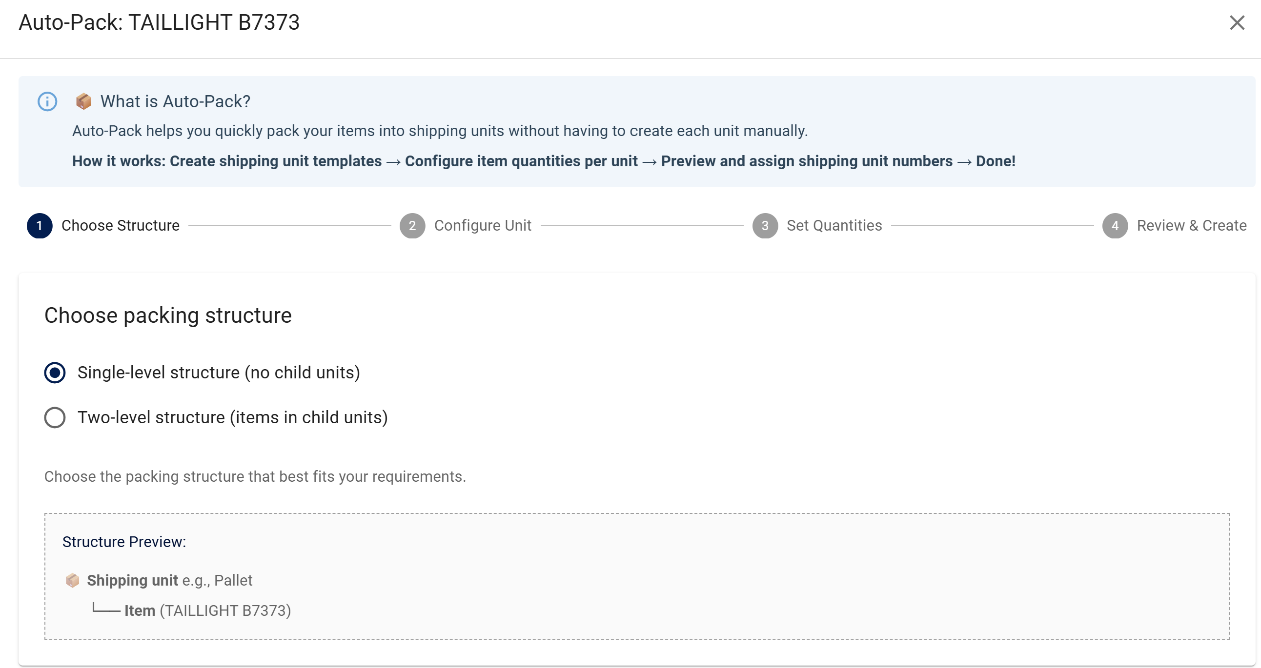1. Choose structure: choose whether creating single-level structure or two-level structure (parent-child structure) of shipment units.