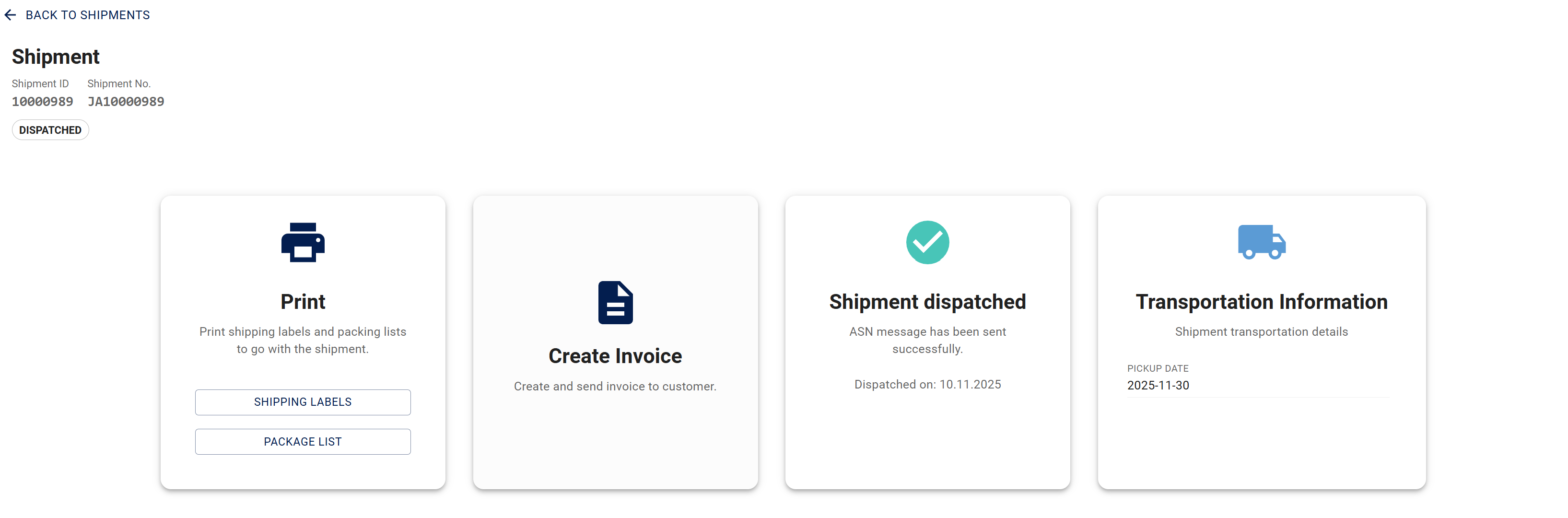 If the shipment is ready, you can mark the ASN as complete by selecting Send ASN. This action will take you to the summary view, where you can still choose to reprint the documents at the top of the page. If your customer requires an invoice to be created, you can do so after completing the ASN by selecting Create Invoice.