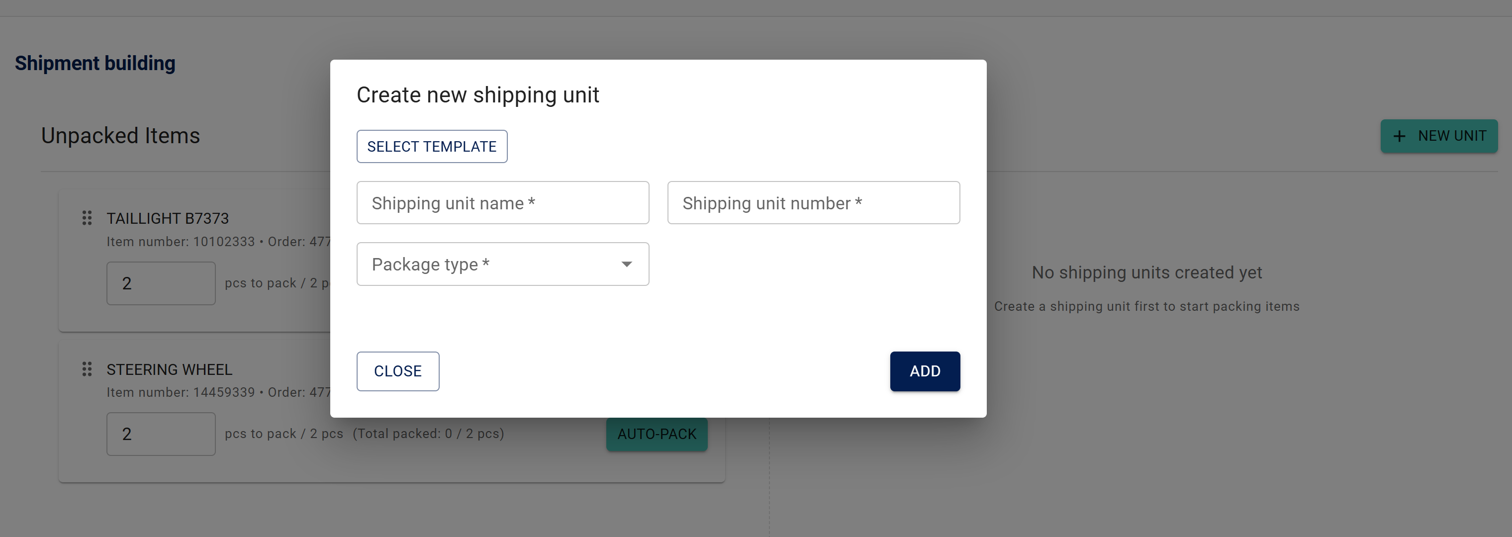 - Select template: Choose from pre-defined shipping units provided by your customer