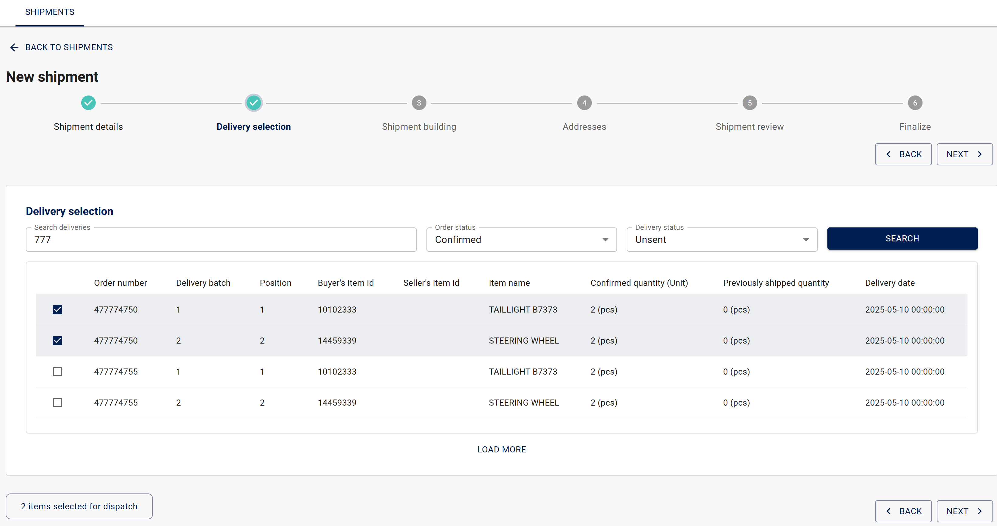 Select deliveries (delivery batches) you are about to deliver with this shipment. Find desired deliveries by searching with PO number, delivery batch number, item name or item number. User may also filter the search by order status (confirmed or not confirmed) or by the shipment status (all, sent, unsent, received).
