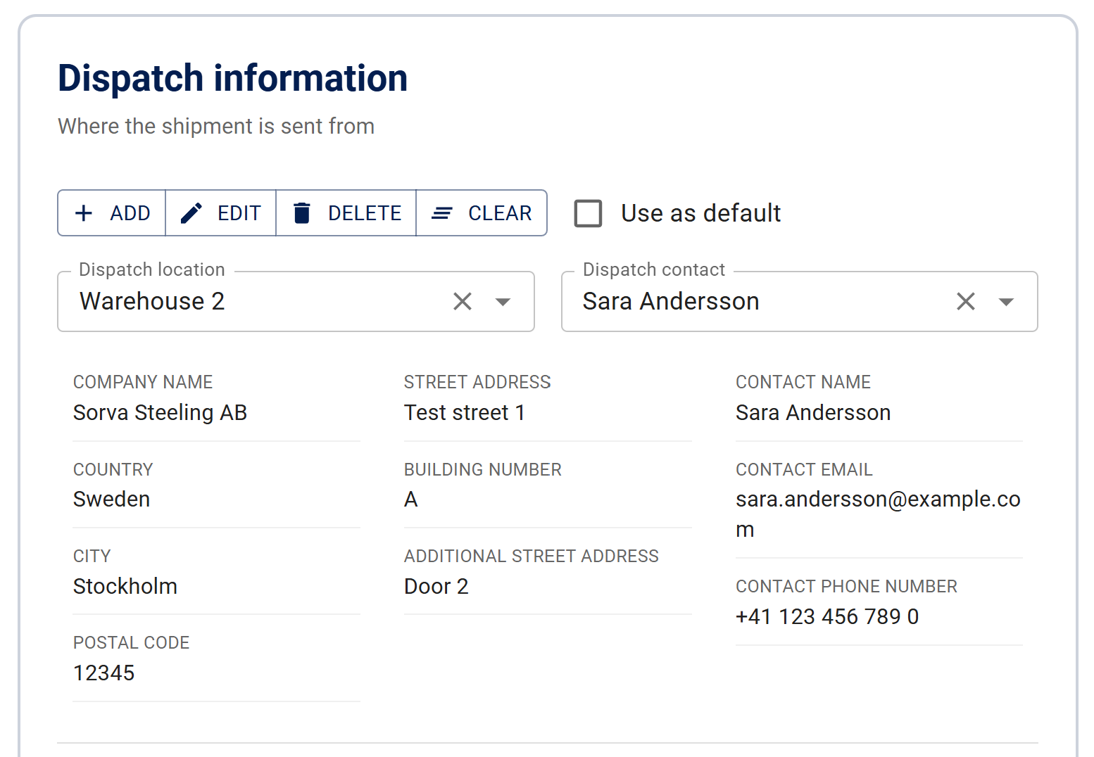 You can define dispatch locations, for example, for transportation purposes while creating new ASN. Saved dispatch locations are stored in Jakamo and will be available for all new ASNs. Select + ADD under Dispatch Information in order to add a new dispatch location.