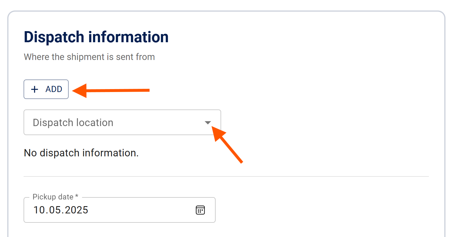 Select the dispatch location from the dropdown menu from previously created locations, or create a new one by selecting Add +.