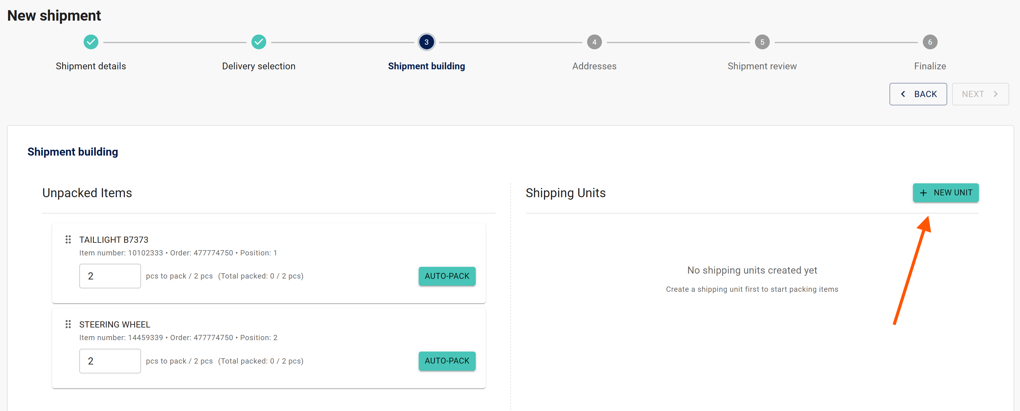 Add one new shipping unit to your shipment by selecting + NEW UNIT: