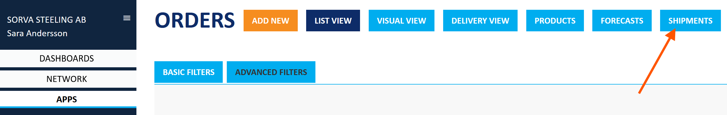 If ASN is available for you with your customer, a tab called SHIPMENTS will appear at the top of the Orders application list view page.