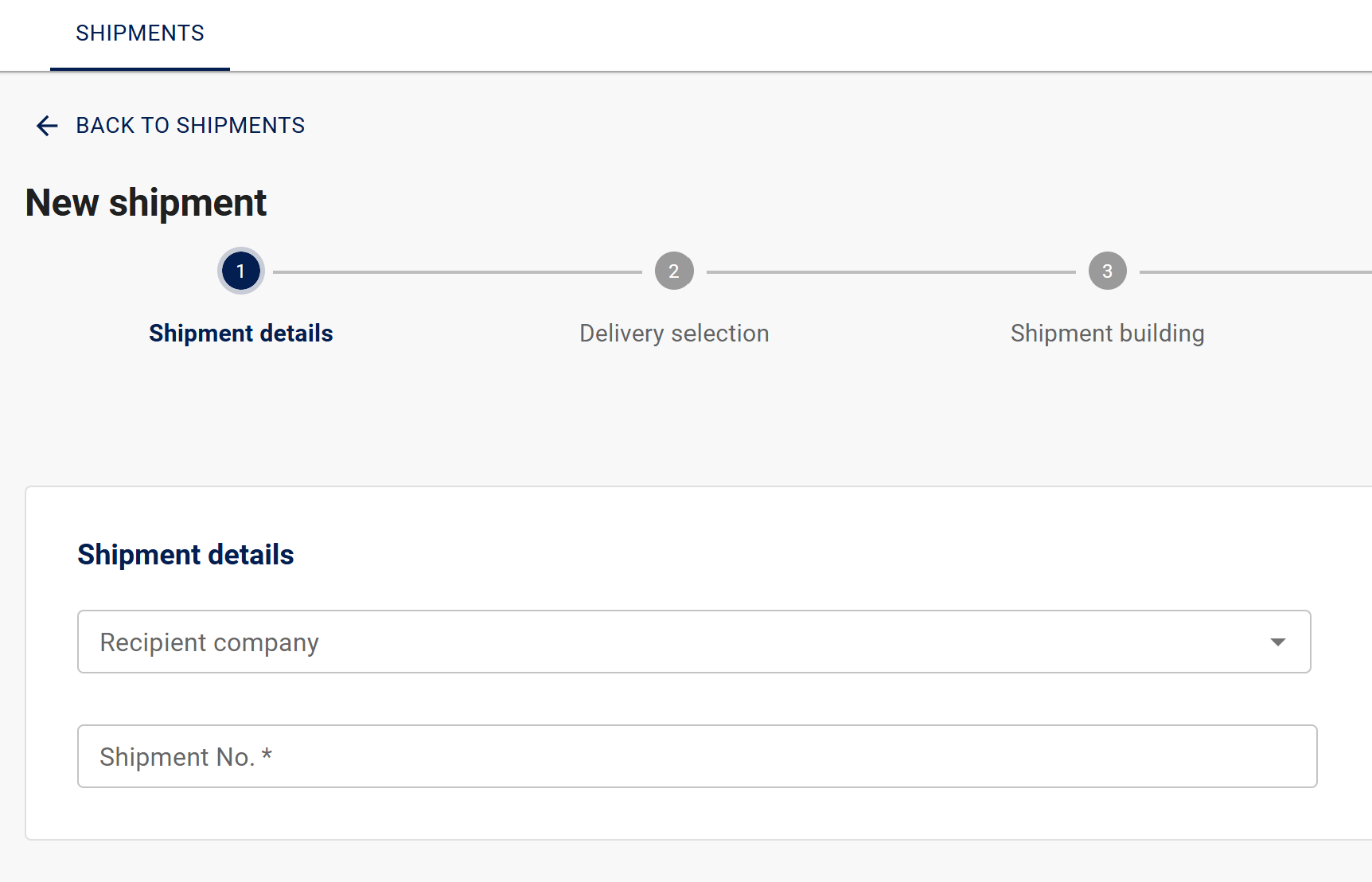 - Recipient company: Select the customer whose order you are delivering from the dropdown menu. A single shipment may only contain products from one customer's orders.