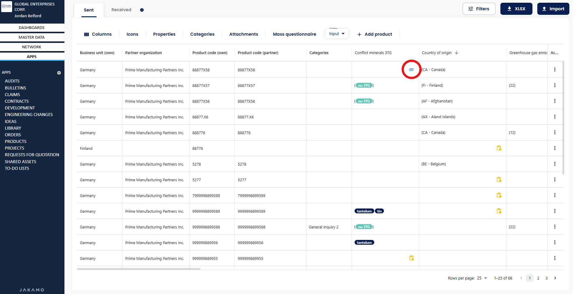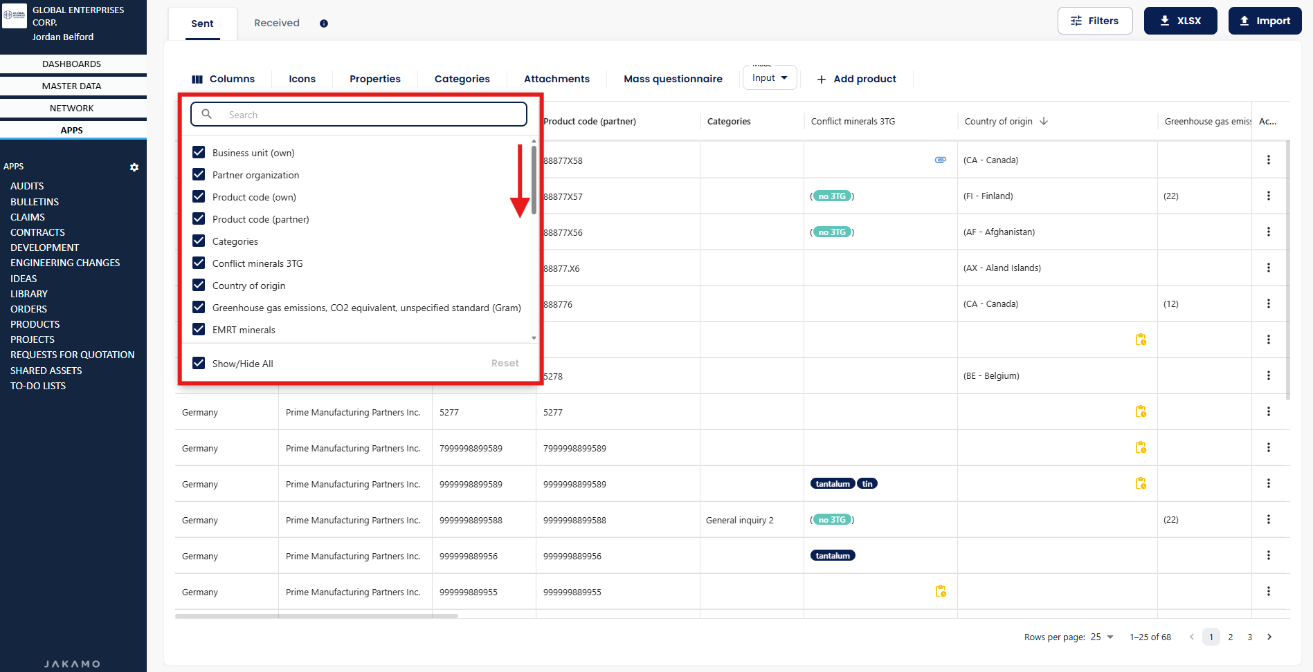 Thus, you can fully define the properties that you want to include in the questionnaire. There are many columns already available that you can see in more detail from here: Columns. We at Jakamo manage the database susch as RoHS, REACH, 3TG & Country of Origin, which will help suppliers keep the information up-to-date in the fast-changing regulation environment.