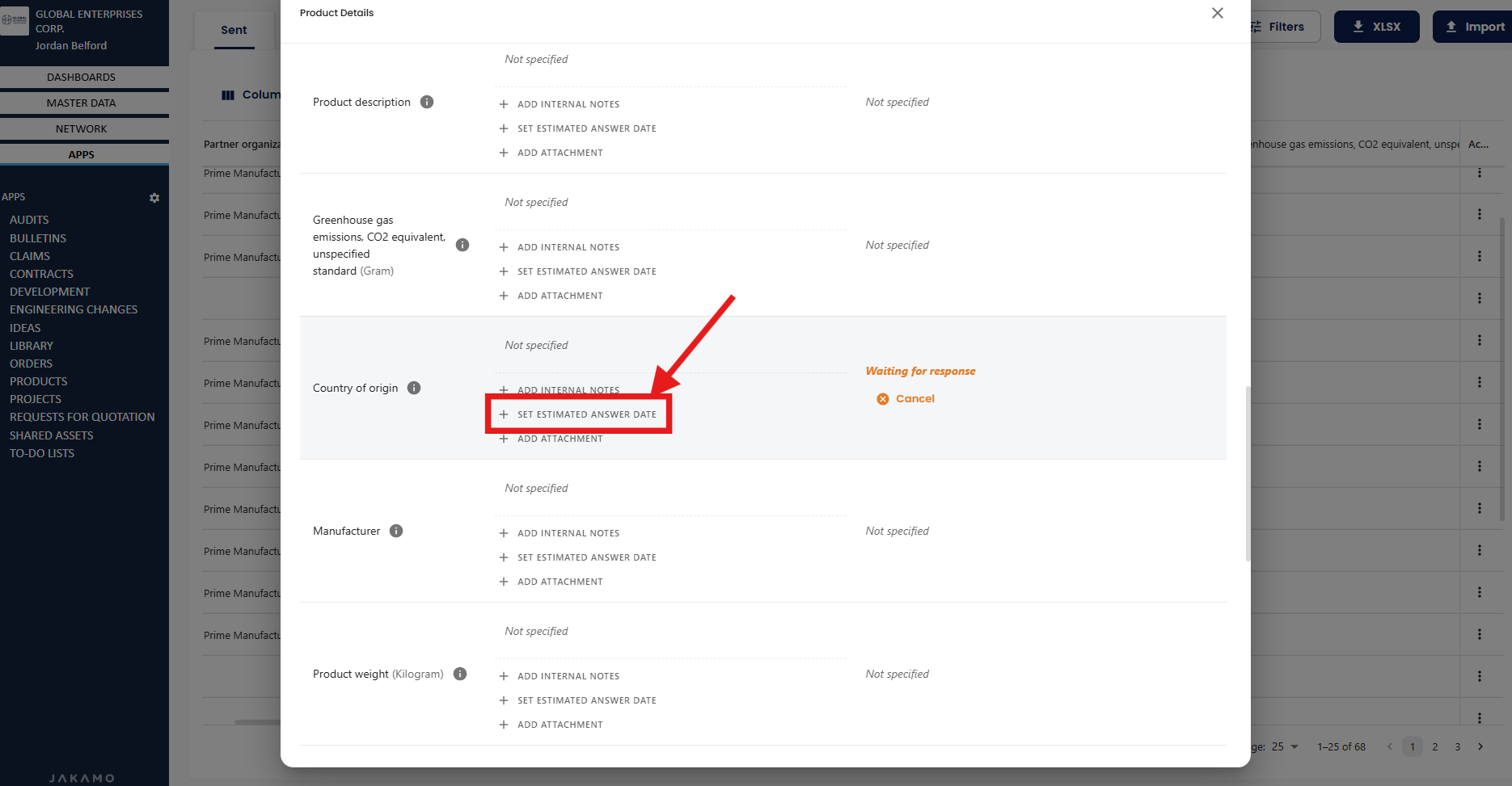 If the supplier is not able to provide the value for an item immediately, an estimated date can be set for when the property value will be added. This helps keep the data collection process on track. To set estimated date: