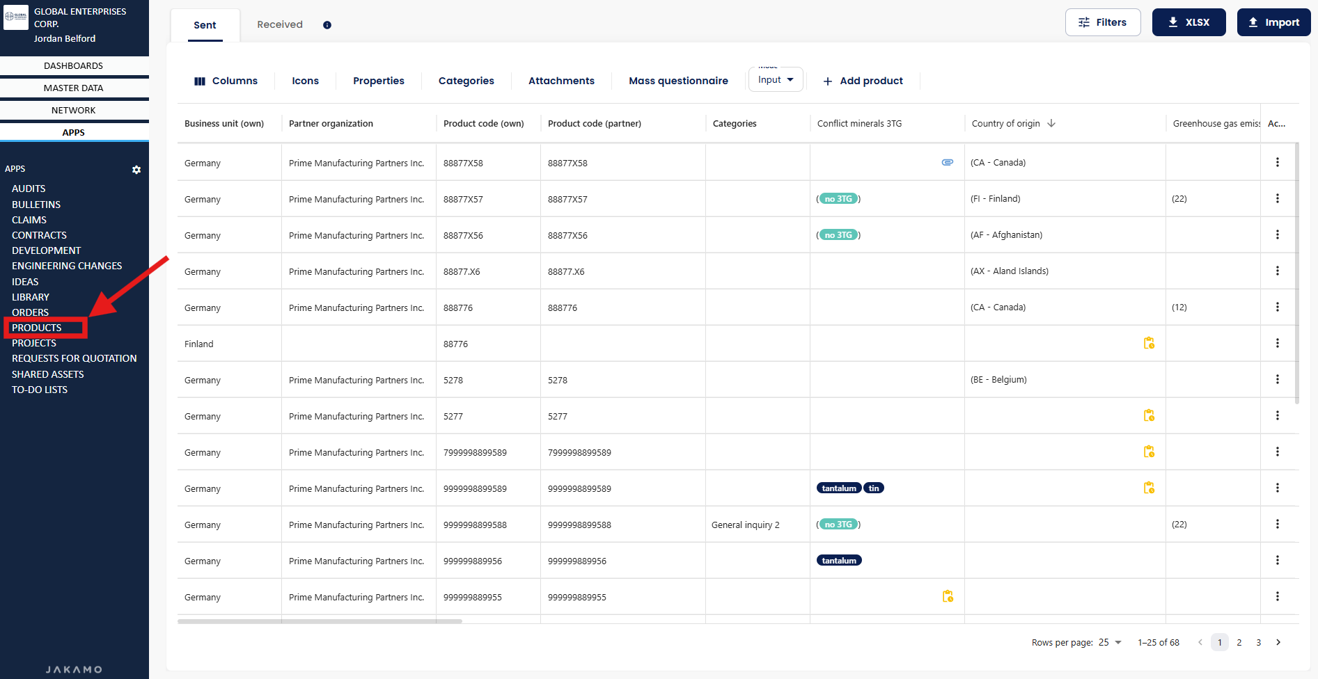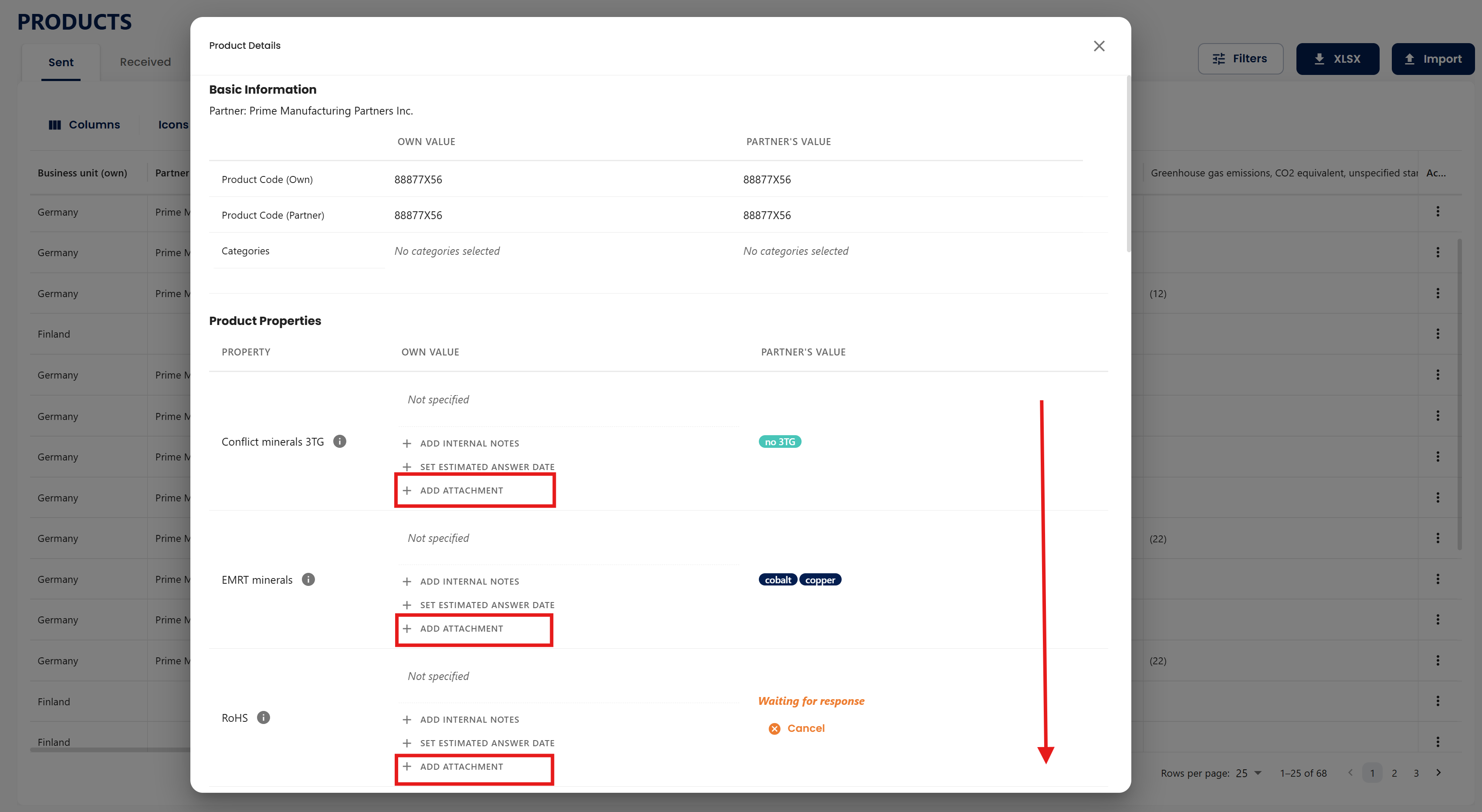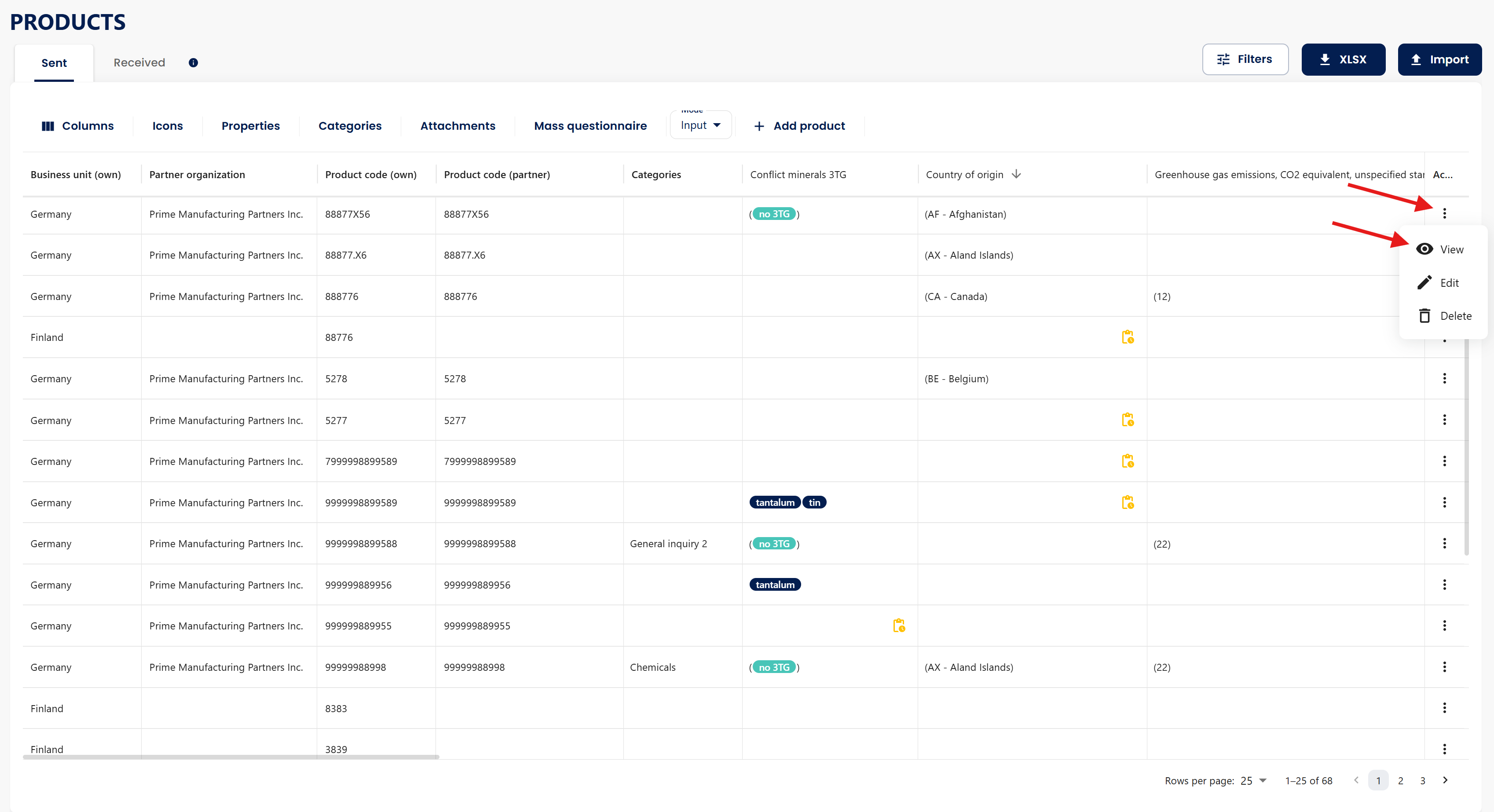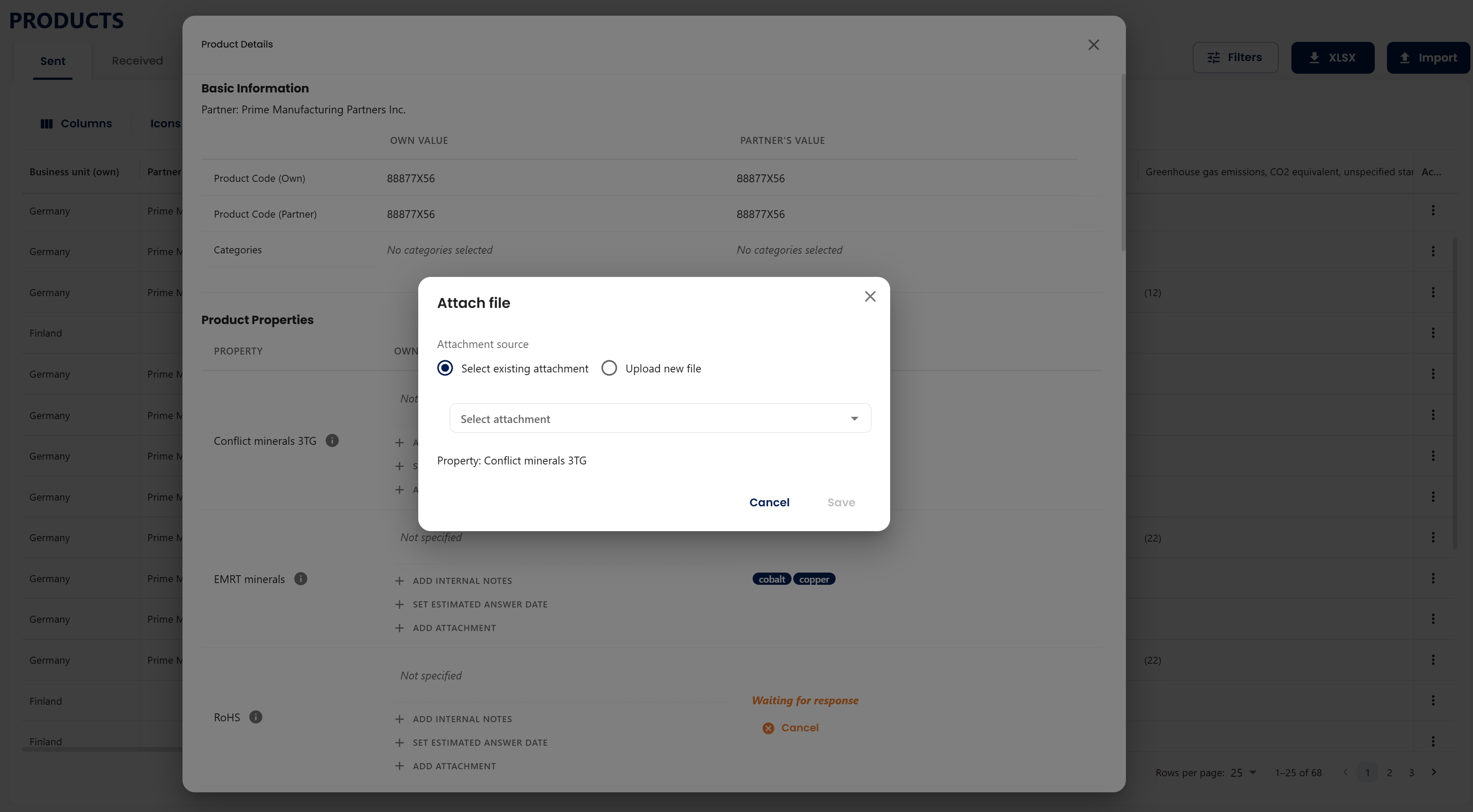 The customer can fully define what item-specific information they want to collect. Whether the need is based on CSRD, CSDDD, EUDR, CBAM, RoHS, REACH, DPP, or something else, this is possible with Products. The collected data can also be exported to an external system via an API interface.