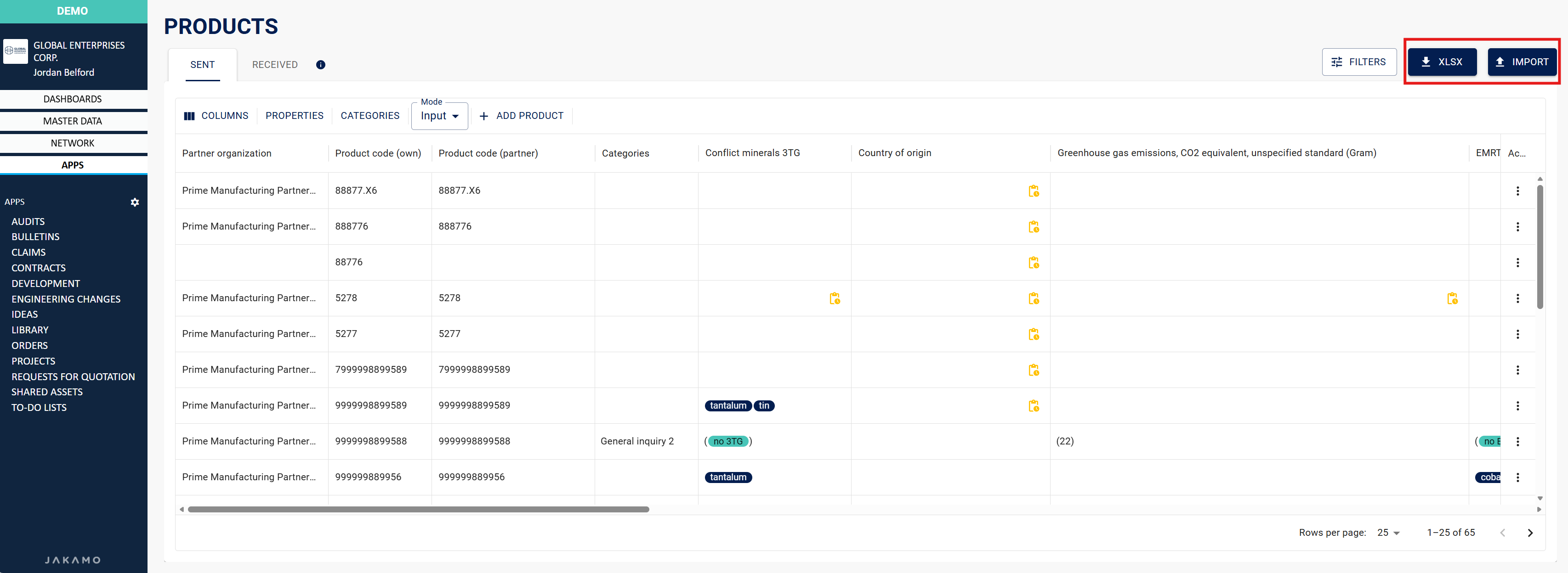 Here you can see all the items that have been ordered via Jakamo or created manually from + Add Product. Each row represents an item, and each column represents a property. You can assign all the items to a specific category, which will automatically send a questionnaire to the supplier about the products included in those categories, OR you can send individual questionnaires manually. If you order the same item from more than one supplier, each item will have its own row.