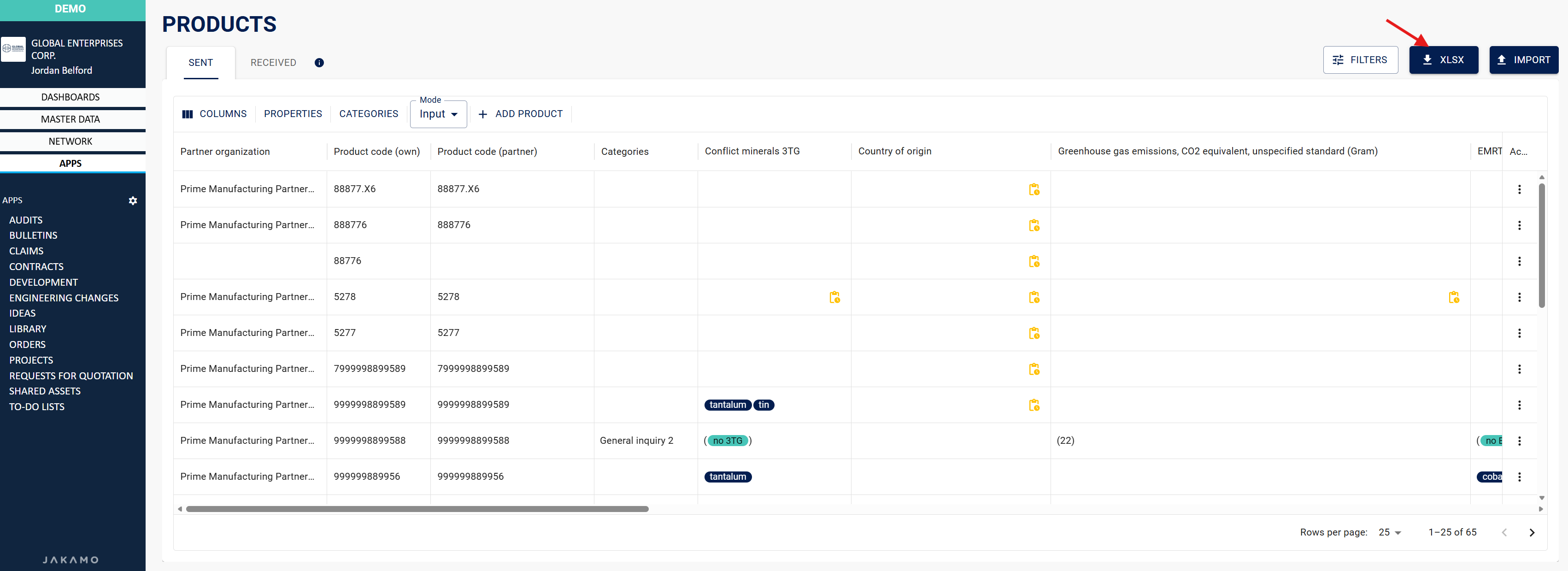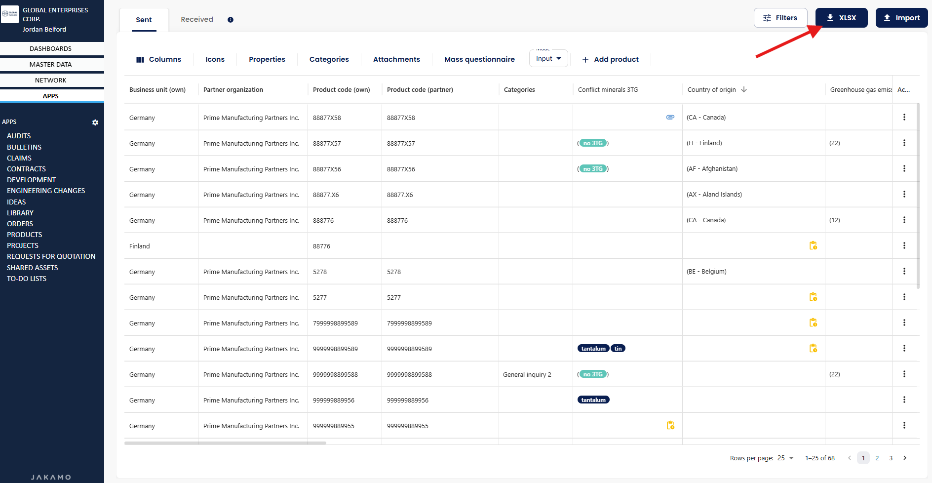 All the completed data can be downloaded as an Excel file, and likewise, it is possible to upload data to Jakamo via Excel import.