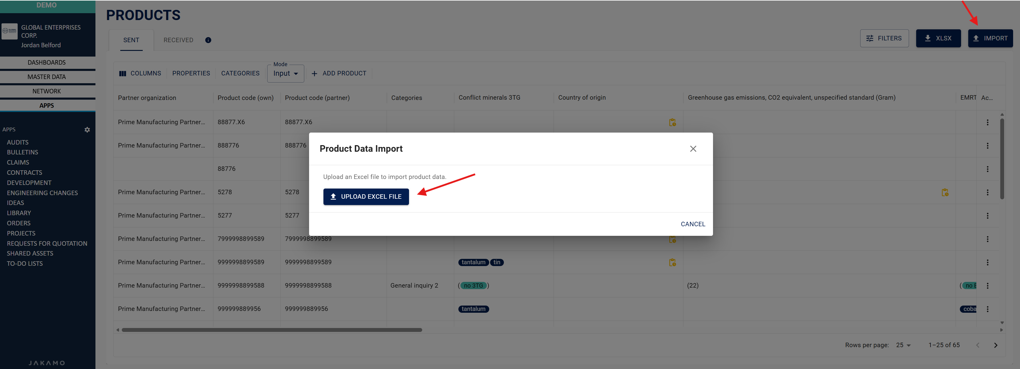 Importing data using Excel can be useful if you have a large number of items or item-specific information to add to Jakamo. By using this feature, data can be uploaded to Jakamo for the first time or updated later. You can fully define what information will be transferred. Your Excel file can contain any type of columns because they will be mapped in Jakamo to match existing columns. Please note that the partner organization (supplier name in Jakamo) and item code (item number in Jakamo) must be included to the Excel in order to transfer information to existing items in Jakamo.