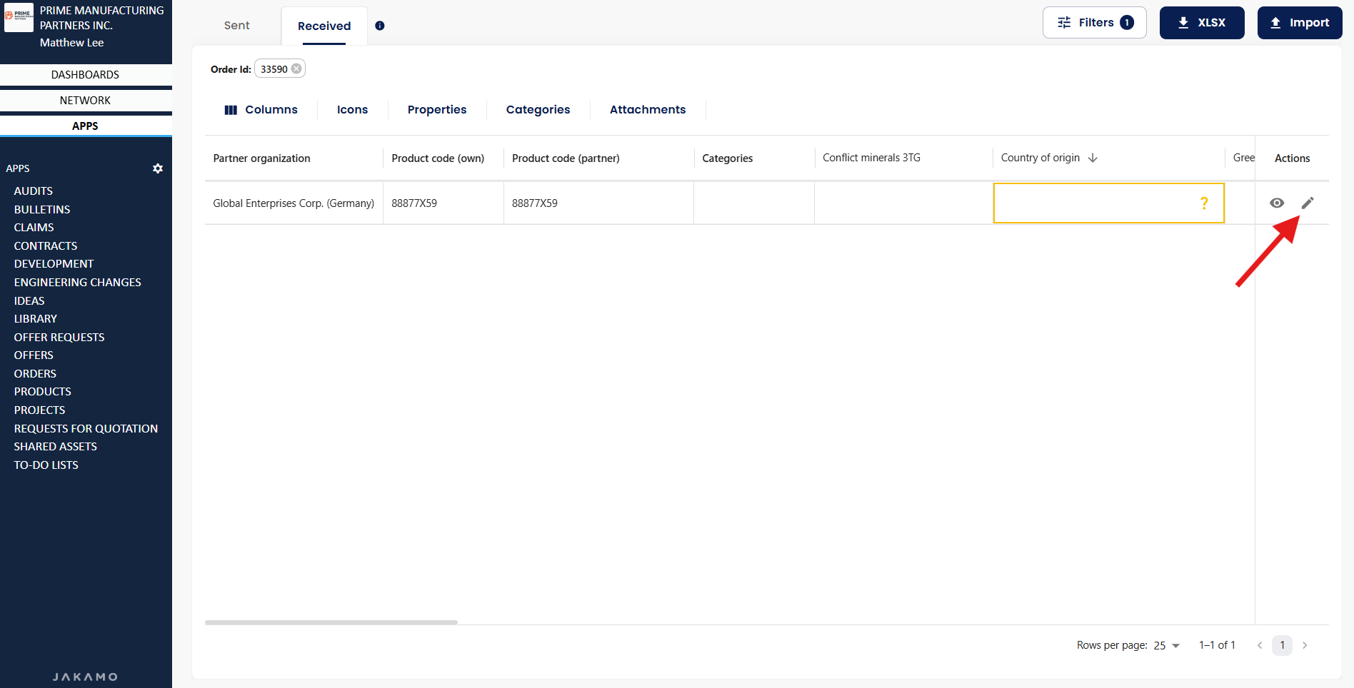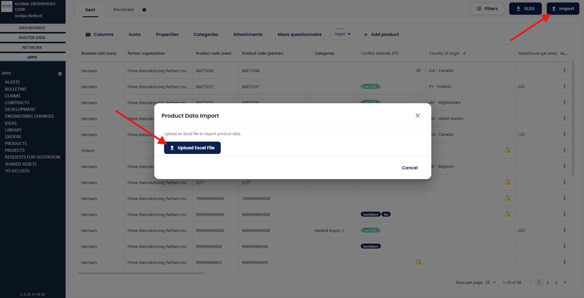 Importing data using Excel can be useful if you have a large number of items or item-specific information to add to Jakamo. By using this feature, data can be uploaded to Jakamo for the first time or updated later. You can fully define what information will be transferred. Your Excel file can contain any type of columns (e.g. Country of origin, REACH, Categories etc.) because they will be mapped in Jakamo to match existing columns. Please note that the partner organization (supplier name in Jakamo) and item code (item number in Jakamo) must be included to the Excel in order to transfer information to existing items in Jakamo.