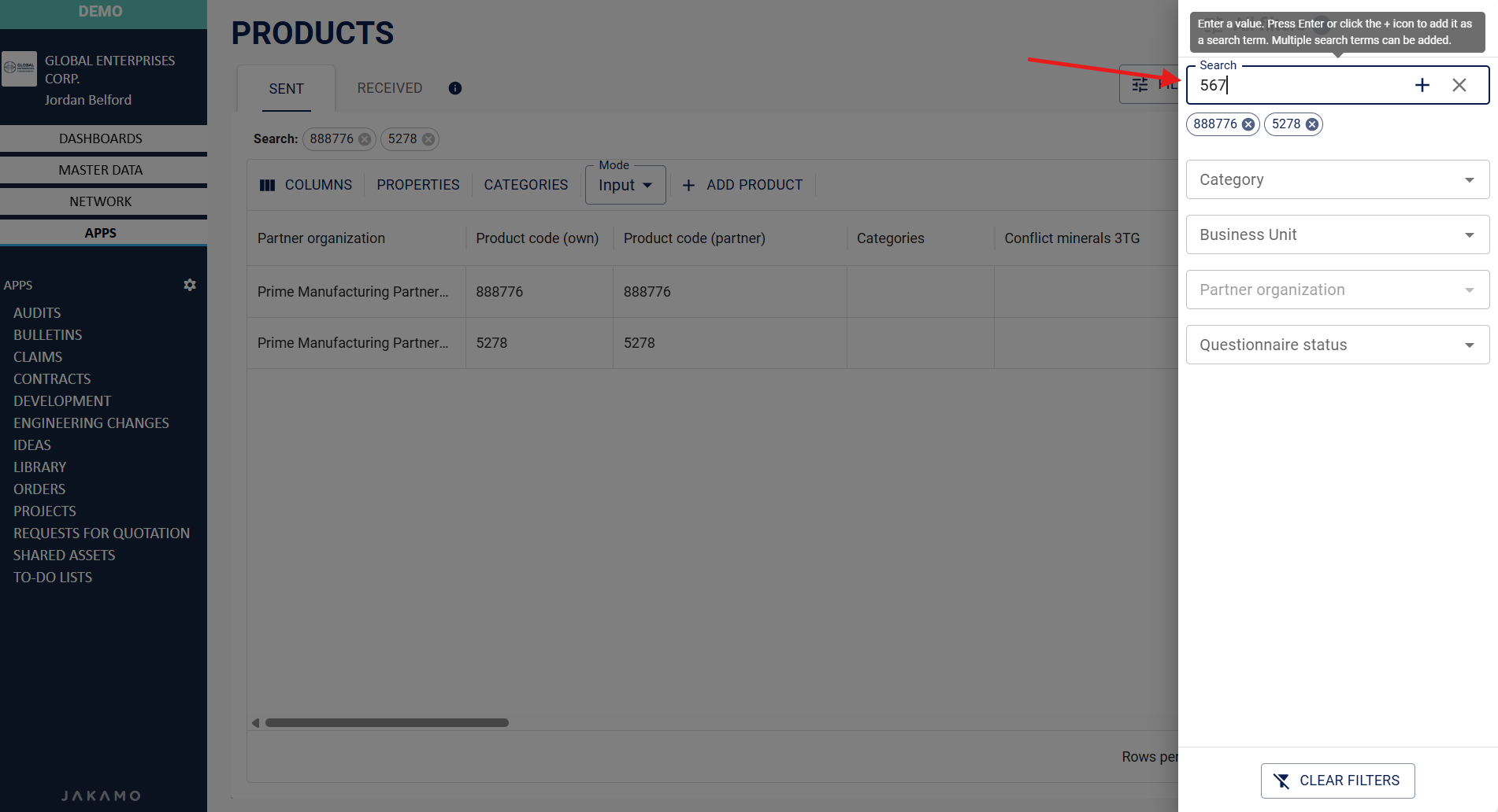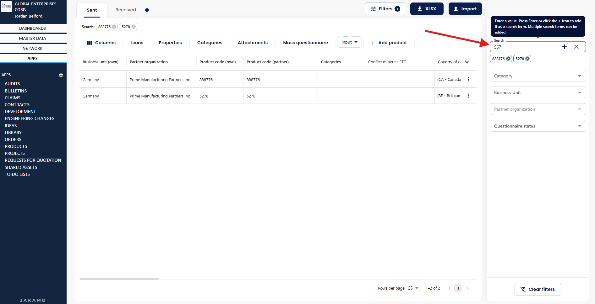 - Search: If there are many items, finding a specific item can be easiest by using direct product search. By entering either your own or your partner's product code, you can display the specific item. You can search for one or multiple items at the same time. Please, note that product codes are also determined based on purchase orders. To search, enter a value and press Enter or click the + icon. Repeat the process if multiple search terms are needed.