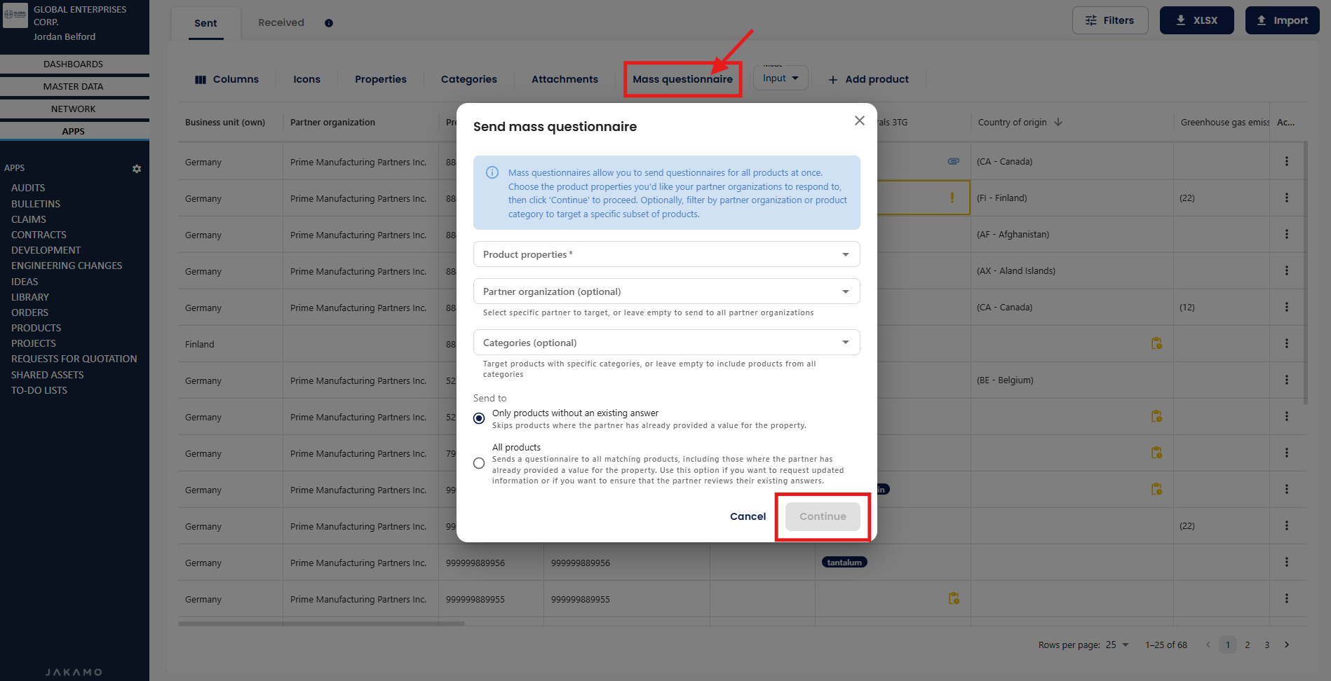 Mass questionnaires allow you to send questionnaires for all products at once. Choose the product properties you'd like your partner organizations to respond to, then click 'Continue' to proceed. Optionally, filter by partner organization or product category to target a specific subset of products. You can choose whether to skip products for which the partner has already provided a value for the property, or to send questionnaires to all matching products, including those where a value has already been provided. Use the latter option if you want to request updated information or ensure that the partner reviews and confirms their existing answers.